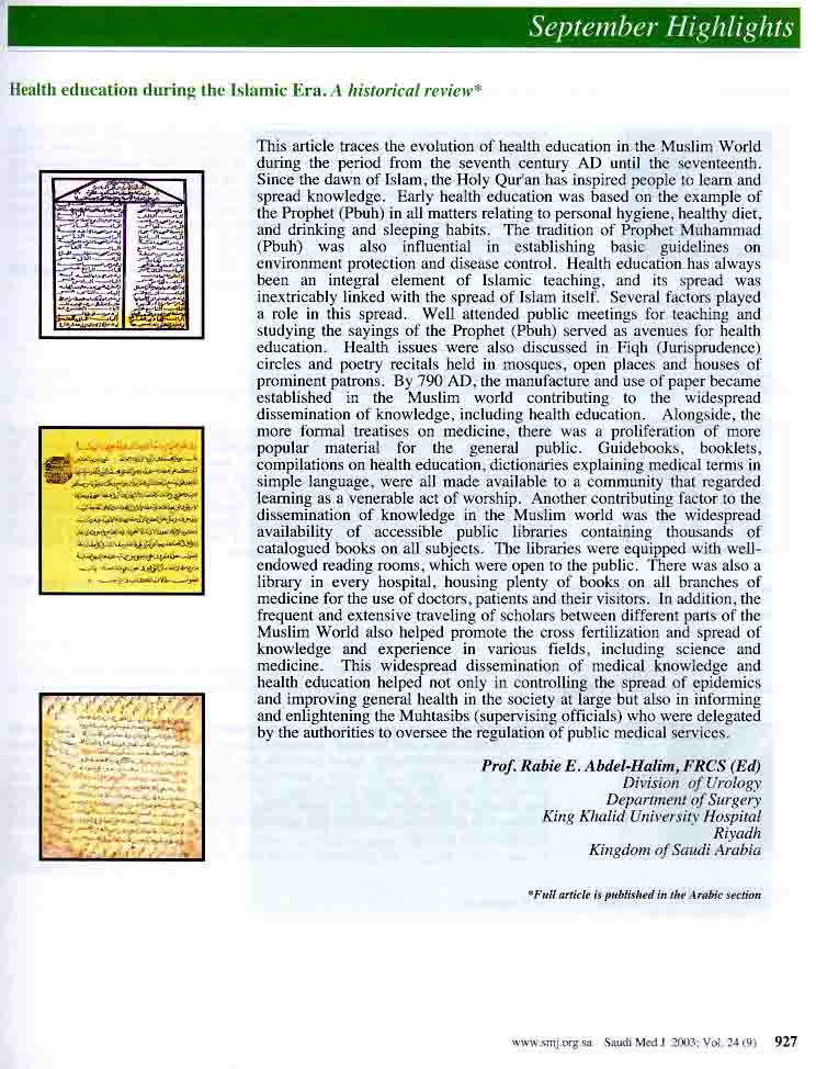 Saudi Medical Journal, 2003, Vol. 24 (9), p 927 (The English Summary), p 188-195 (The Arabic Text)